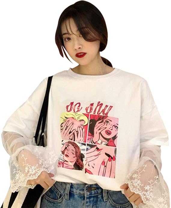 Hongma T Shirt Femme Personnage Dessin Anime Patchwork Dentelle Manches Longues Evasees Col Rond Blanc Amazon Fr Vetements Et Accessoires
